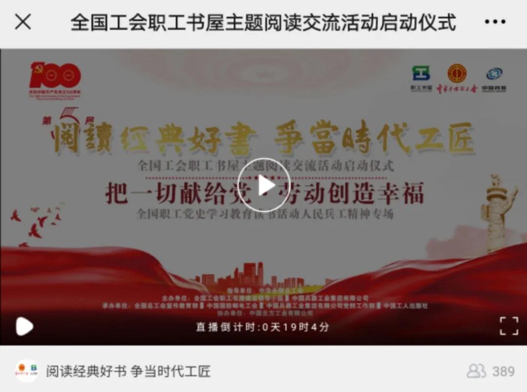 又到一年世界讀書(shū)日,激蕩在全國職工朋友心中的“閱讀經(jīng)典好書(shū) 爭當時(shí)代工匠”又一次在神州大地叫響。今年,“把一切獻給黨 勞動(dòng)創(chuàng )造幸?!?/strong>成為了閃亮的主題,在億萬(wàn)職工中掀起心潮。 今天(4月23日)下午 15:00,第五屆“閱讀經(jīng)典好書(shū) 爭當時(shí)代工匠”全國工會(huì )職工書(shū)屋主題閱讀交流活動(dòng)啟動(dòng)儀式暨“把一切獻給黨·勞動(dòng)創(chuàng )造幸?!?/strong>全國職工黨史學(xué)習教育讀書(shū)活動(dòng)人民兵工精神專(zhuān)場(chǎng)隆重開(kāi)啟! 多項閱讀計劃同場(chǎng)發(fā)布、多本經(jīng)典好書(shū)現場(chǎng)推薦、多位職工誦讀演繹紅色經(jīng)典、勞模代表進(jìn)行閱讀分享和倡議,讓我們共同在閱讀中感悟紅色經(jīng)典,在活動(dòng)中傳承精神力量。 這一年一度的全國職工閱讀盛典,你還在等什么! 看!在建黨百年的歷史節點(diǎn),職工現場(chǎng)誦讀紅色經(jīng)典《把一切獻給黨》,傳承以吳運鐸為代表的人民兵工精神,感悟經(jīng)典的魅力和信仰的力量。 聽(tīng)!來(lái)自兵器工業(yè)集團的全國勞模代表在現場(chǎng),向廣大職工朋友發(fā)出閱讀倡議。分享在黨的領(lǐng)導下,大國重器由跟仿跟研到世界領(lǐng)先的蛻變。 來(lái)!聚焦現場(chǎng),正式啟動(dòng)第五屆“閱讀經(jīng)典好書(shū) 爭當時(shí)代工匠”全國工會(huì )職工書(shū)屋主題閱讀交流活動(dòng),同時(shí)點(diǎn)亮專(zhuān)屬人民兵工精神的火炬,讓閱讀熱情傾力綻放。 40余家省級工會(huì )新媒體 100余家市級工會(huì )新媒體 200余家知名企業(yè)工會(huì )新媒體 同步直播 精彩即將上演 直播在哪看? STEP1 關(guān)注全總職工書(shū)屋微信號 點(diǎn)擊下方菜單欄-活動(dòng)專(zhuān)區 觀(guān)看直播啦 還可以同步觀(guān)看圖片直播 記錄下每個(gè)精彩時(shí)刻 |